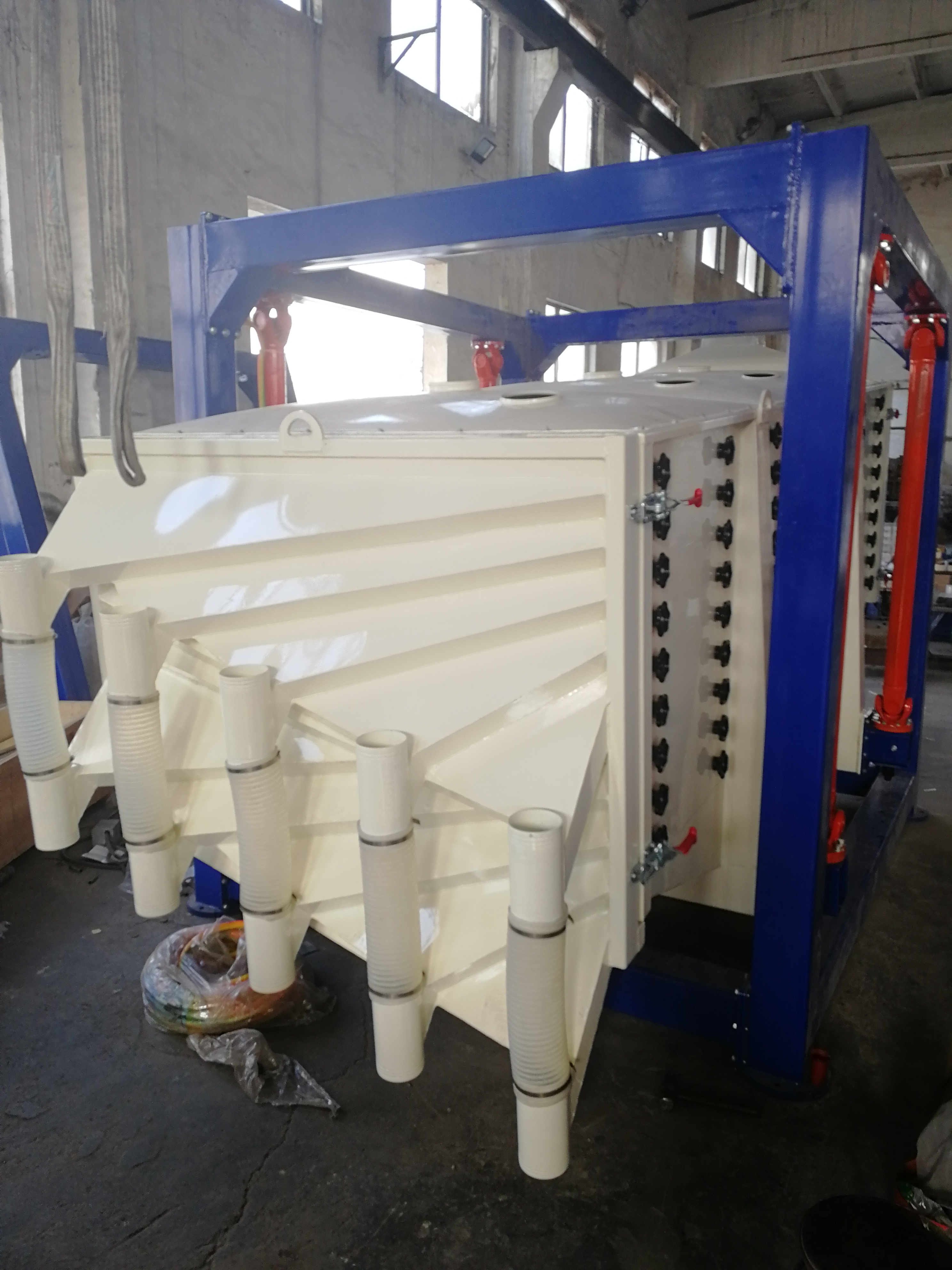 方形箱式搖擺篩結(jié)構(gòu)圖 (平面搖擺篩與方形搖擺篩) 搖擺篩被眾多用戶(hù)所熟知,其篩分設(shè)備因?yàn)楫a(chǎn)量大,篩分精度高,使用壽命長(zhǎng)等特點(diǎn),在各行業(yè)應(yīng)用廣泛,比較擅長(zhǎng)篩分中細(xì)精度的物料,常見(jiàn)篩分70目-180目的粉末或者顆粒類(lèi)物料。方形箱式搖擺篩更能滿(mǎn)足用戶(hù)的篩分產(chǎn)量要求,下面來(lái)說(shuō)明一下方形箱式搖擺篩的結(jié)構(gòu)。方形箱式搖擺篩由篩箱、篩框、篩網(wǎng)、清網(wǎng)裝置、支撐框架、驅(qū)動(dòng)電機(jī)、傳動(dòng)皮帶、激振器、搖擺臂(萬(wàn)向軸)、進(jìn)出料口、吊耳、觀(guān)察口等結(jié)構(gòu)組成,其篩分動(dòng)作類(lèi)似人工篩分動(dòng)作,可以在篩分過(guò)程中保留物料的物理性狀,而