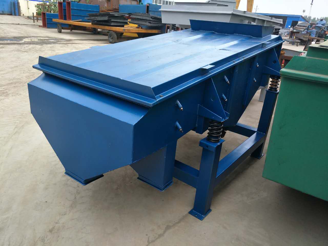 了解直線振動篩結(jié)構(gòu)(直線振動篩的原理) 該篩機(jī)主要由篩箱、篩框、篩網(wǎng)、振動電機(jī)、電機(jī)臺座、減振彈簧、支架等組成。 1、篩箱:由數(shù)種厚度不同的鋼板焊制而成,具有一定的強(qiáng)度和剛度,是篩機(jī)的主要組成部分。 2、篩框:由松木或變形量較小的木材制成,主要用來保持篩網(wǎng)平整,達(dá)到正常篩分。 3、篩網(wǎng):有低碳鋼、黃銅、青銅、不銹鋼絲等數(shù)種篩網(wǎng)。就我公司來說,現(xiàn)在直線振動篩一般都是用的不銹鋼篩網(wǎng)為304材質(zhì)。 4、振動電機(jī)(使用與維修方法詳見振動電機(jī)使用說明書)。 5、電機(jī)臺座:安裝振動電機(jī),使用前連接螺釘必