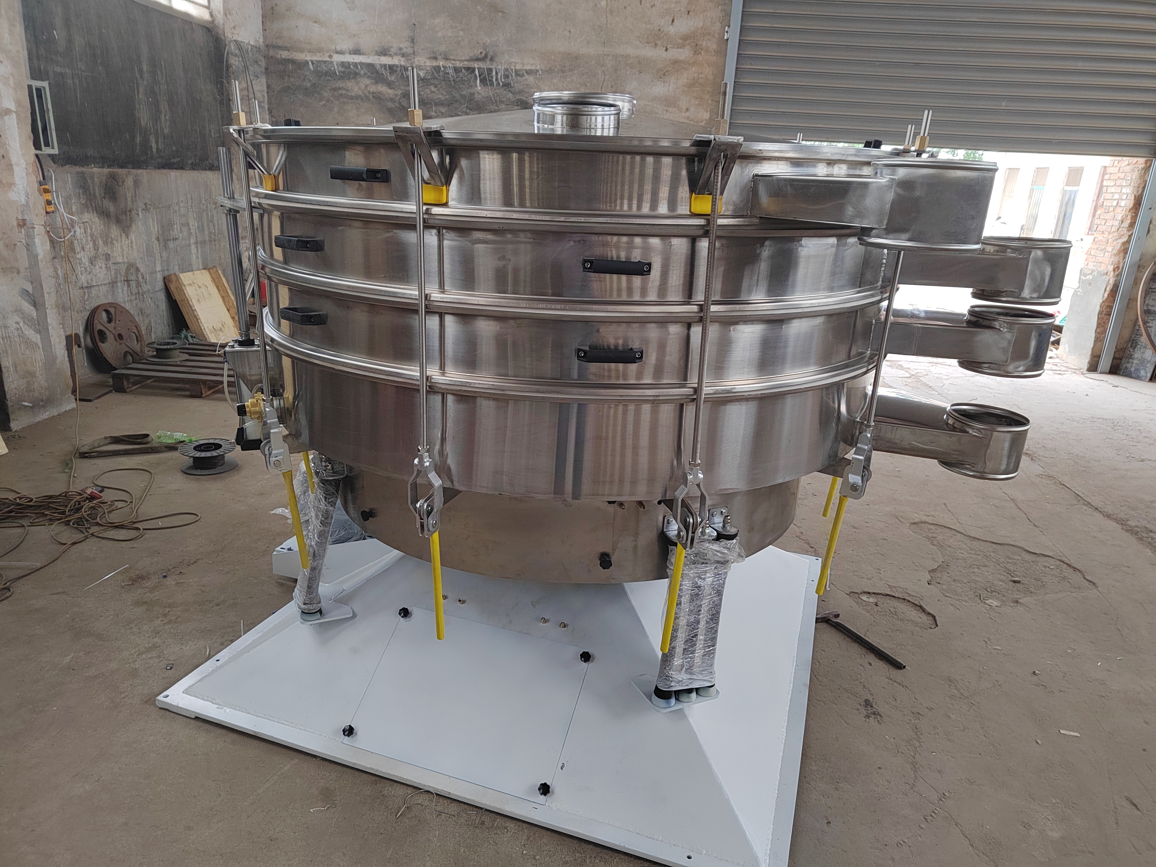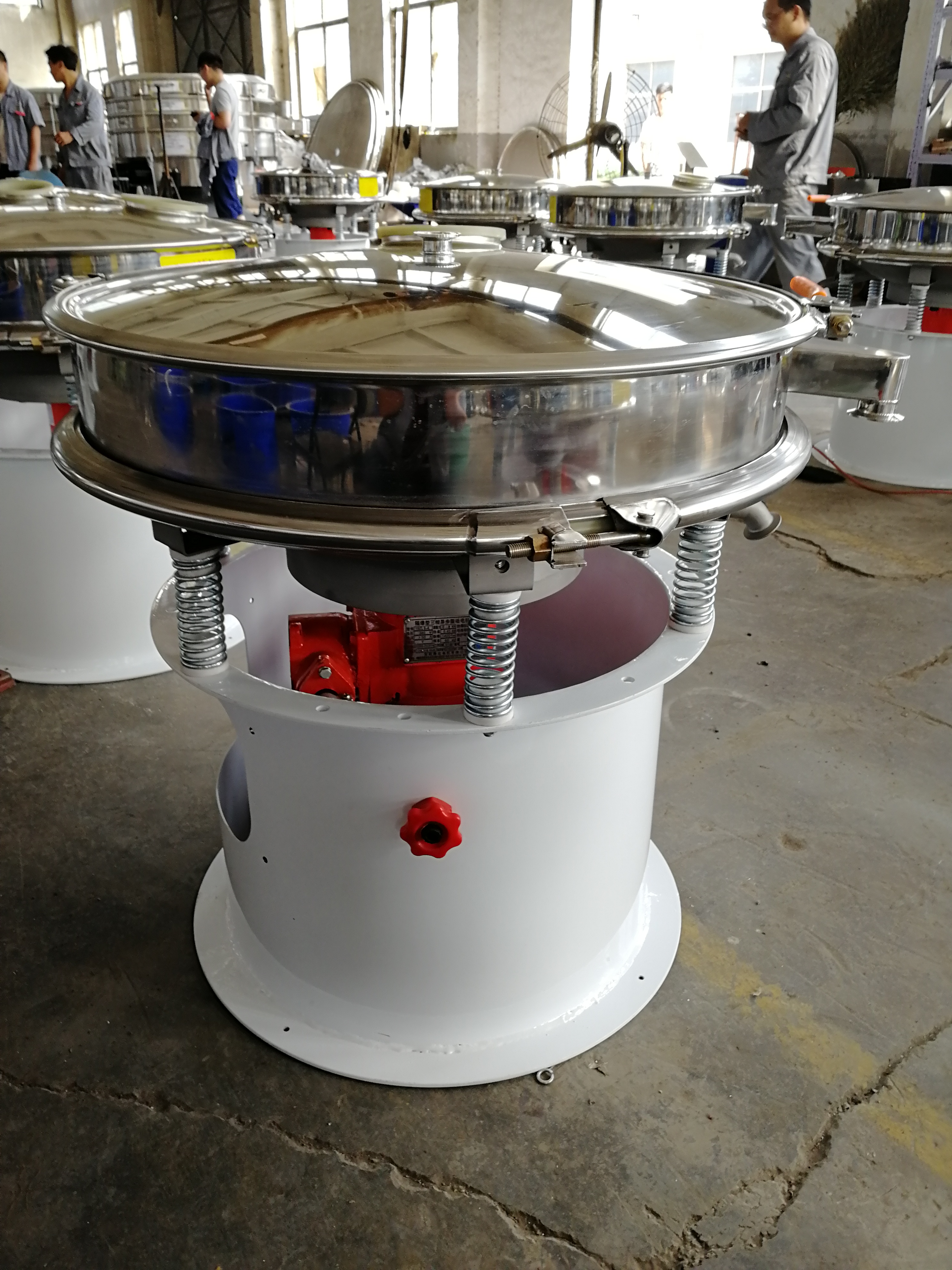 800型振動篩普鋼跟不銹鋼差多少錢? 800型振動篩普鋼跟不銹鋼差多少錢? 普鋼800型振動篩即可單層粉末除雜、也可多層粒度分級、也可固液分離過濾使用,根據(jù)自己需要定制層數(shù)即可(可分層自由組合拆裝),是性價比高、一機多用的通用篩選設(shè)備。其噪音低、效率高,快速換網(wǎng)需3-5分鐘,全封閉結(jié)構(gòu),適用于粒、粉、粘液等物料的篩分和過濾。旋振篩是由直立式振動電機做激振源,電機上、下兩端安裝有偏心重錘,將電機的旋轉(zhuǎn)運動轉(zhuǎn)變?yōu)樗?、垂直、傾斜的三次元運動,再通過彈簧的減震助振作用把這個三次元運動傳遞給篩面,